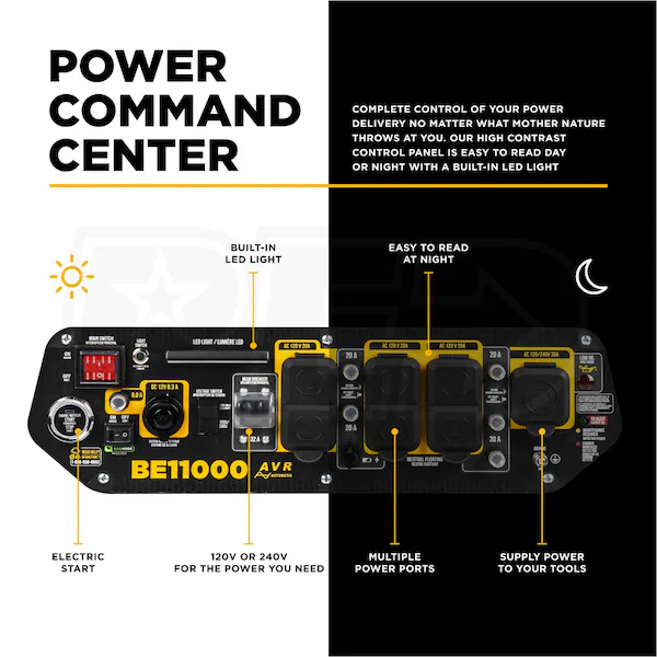 The BE Power Equipment BE11000 is built to deliver dependable power during emergencies and outages. With electric start, CO detection, long runtime, and a rugged steel frame, this portable generator ensures your household stays powered safely and efficiently.
